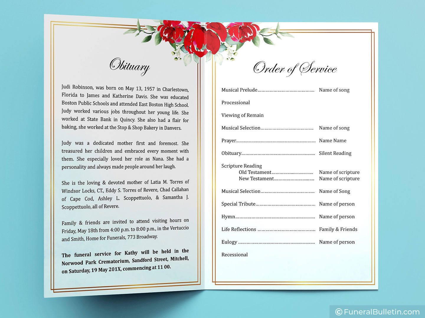 Losing a loved one is a profoundly difficult time, and organizing a funeral service should not add to your emotional burden. Our beautifully designed and fully editable 8 page funeral program template offers a dignified, comprehensive solution. These funeral program pages are artfully decorated with watercolor style red roses and leaves illustrations set against a calming bluish shade on the background, creating a meaningful memorial booklet that truly honors a life well-lived.