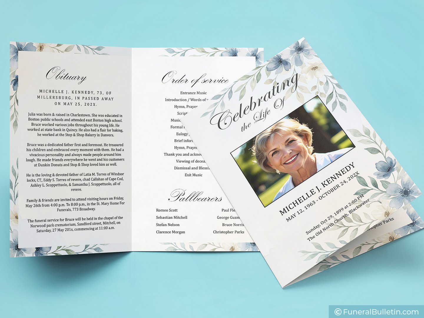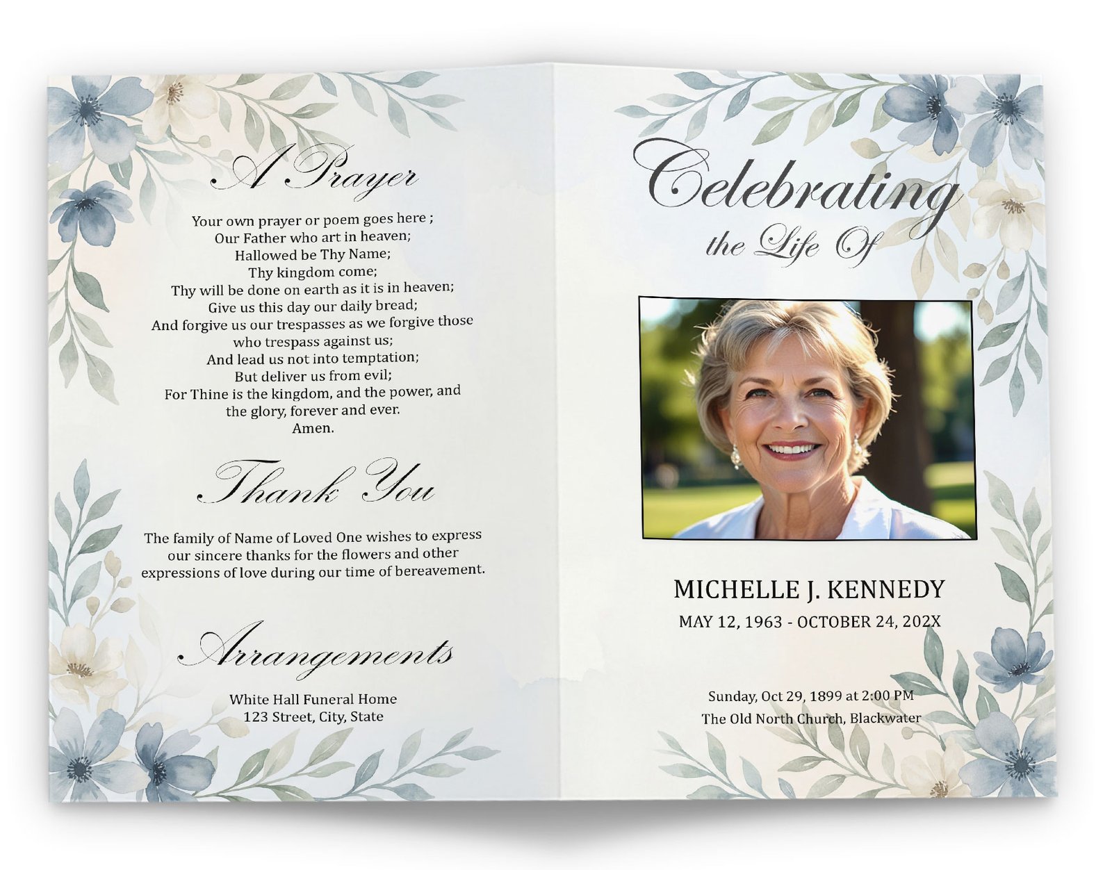 This blue floral tribute works beautifully for a mother, grandmother, or any woman who appreciated the simple beauty of nature. Because it is a digital download, you can start editing immediately and print as many copies as you need.