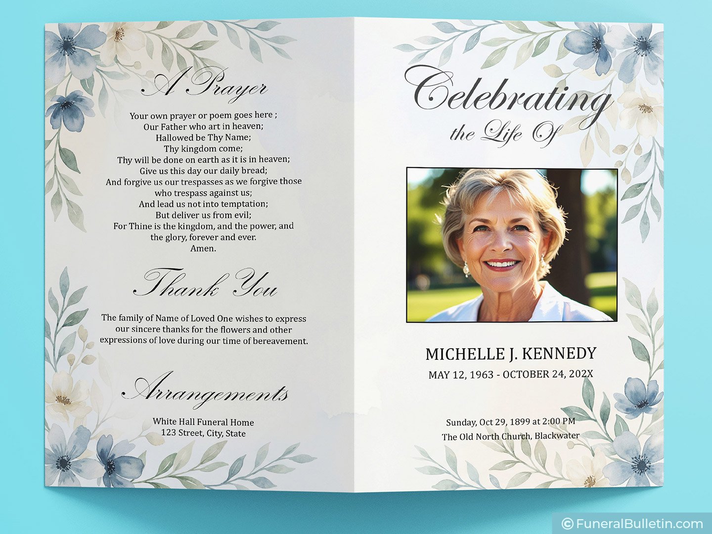 This bifold program template brings a sense of calm and dignity to any memorial service. Featuring delicate blue watercolor blossoms and soft green foliage, the design provides a peaceful backdrop for honoring a cherished legacy. The clean white space ensures that your photos and words remain the focal point throughout the entire layout.