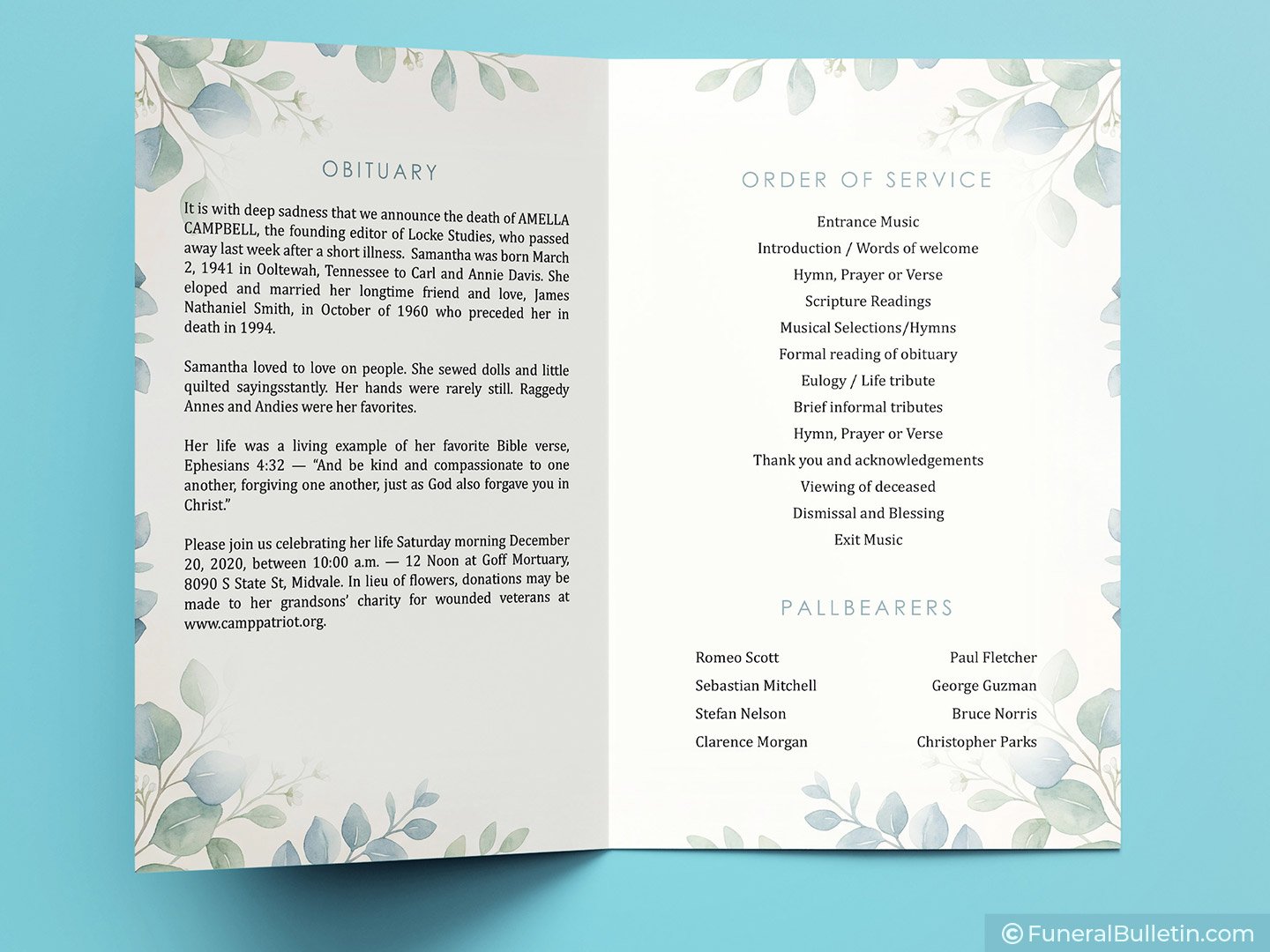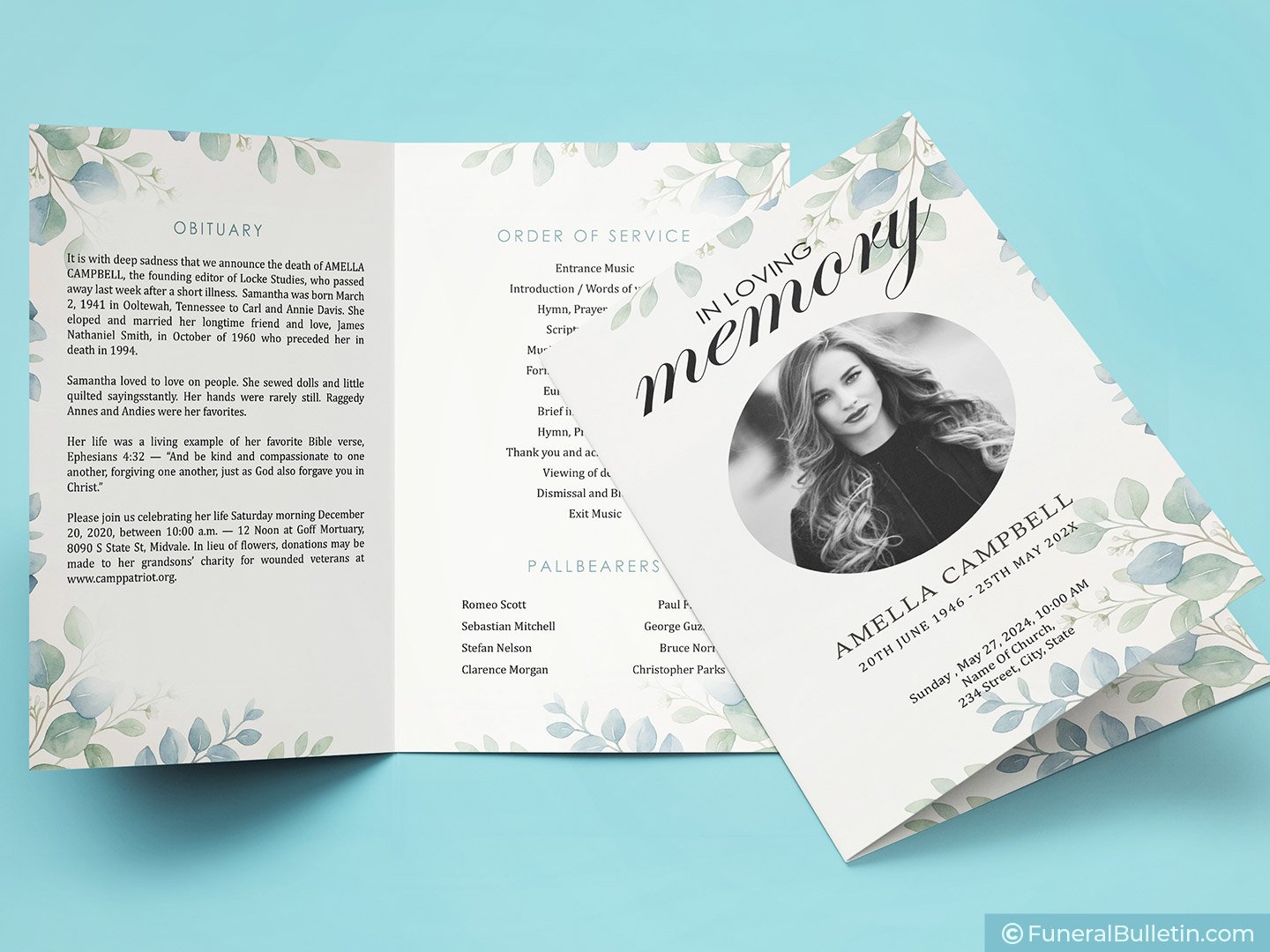 This elegant bifold layout allows you to share a complete life story without feeling cramped or cluttered. The soft sage and dusty blue watercolor leaves provide a natural, airy border that feels both modern and timeless. Unlike standard designs, this layout prioritizes the written word, making it the perfect canvas for honoring a unique legacy.