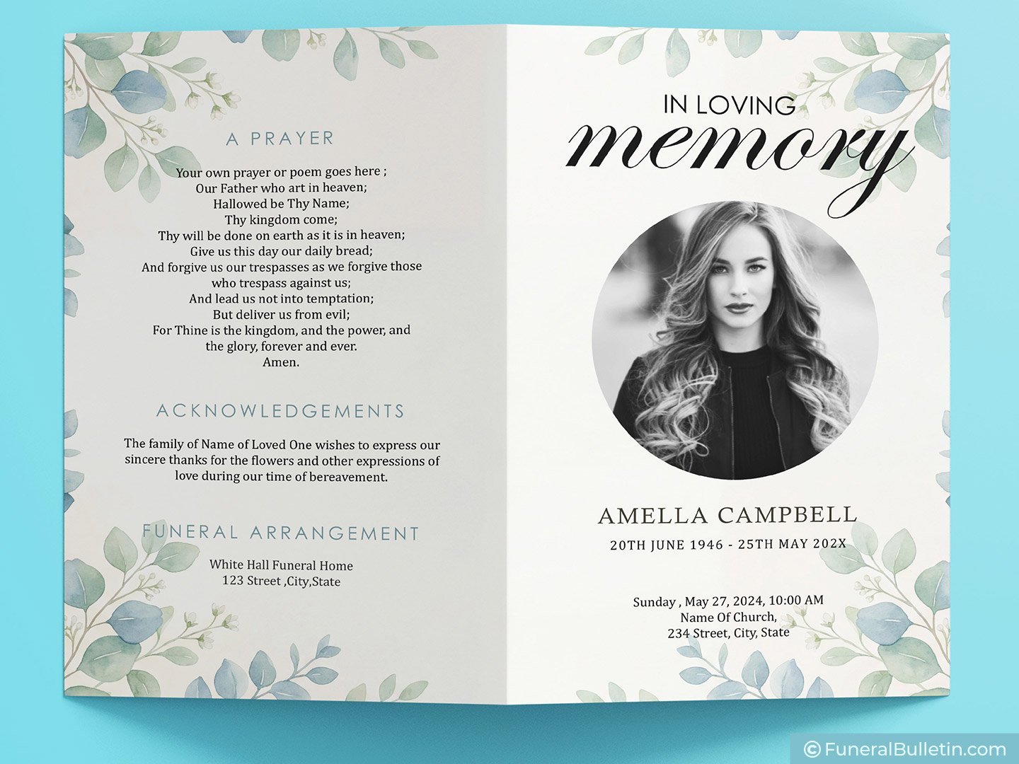 This bifold layout offers a clean, serene aesthetic for those who want to honor a loved one with simplicity and grace. The delicate watercolor foliage creates a calming frame for your photos and heartfelt words. It is a design that speaks of peace and natural beauty.