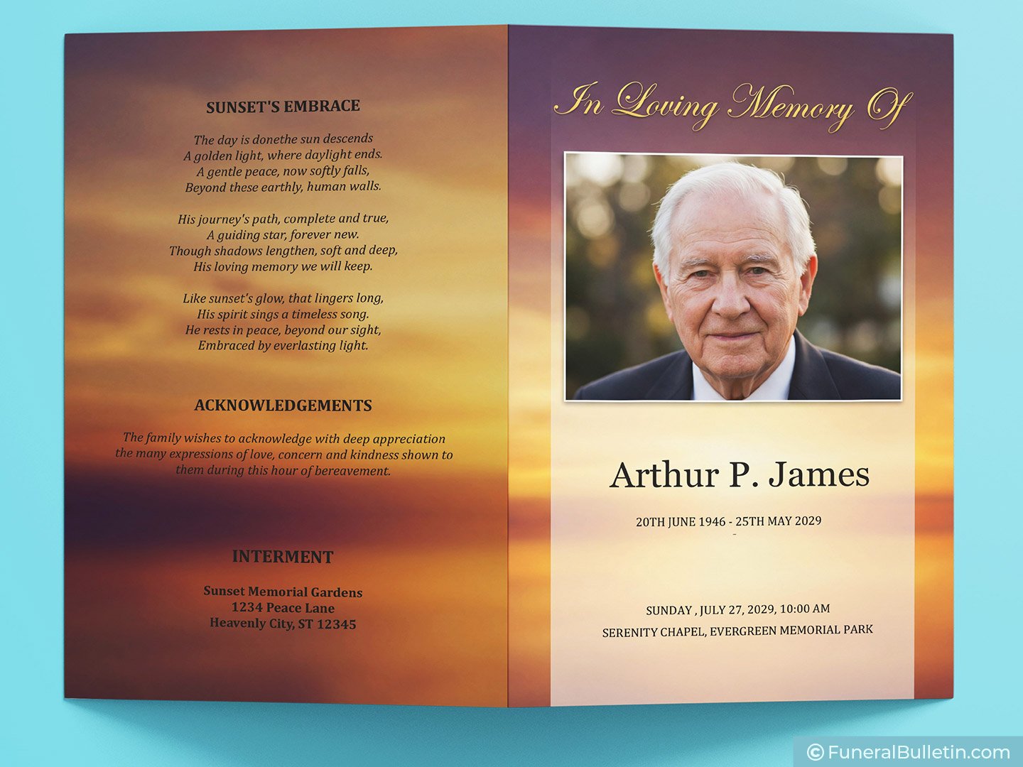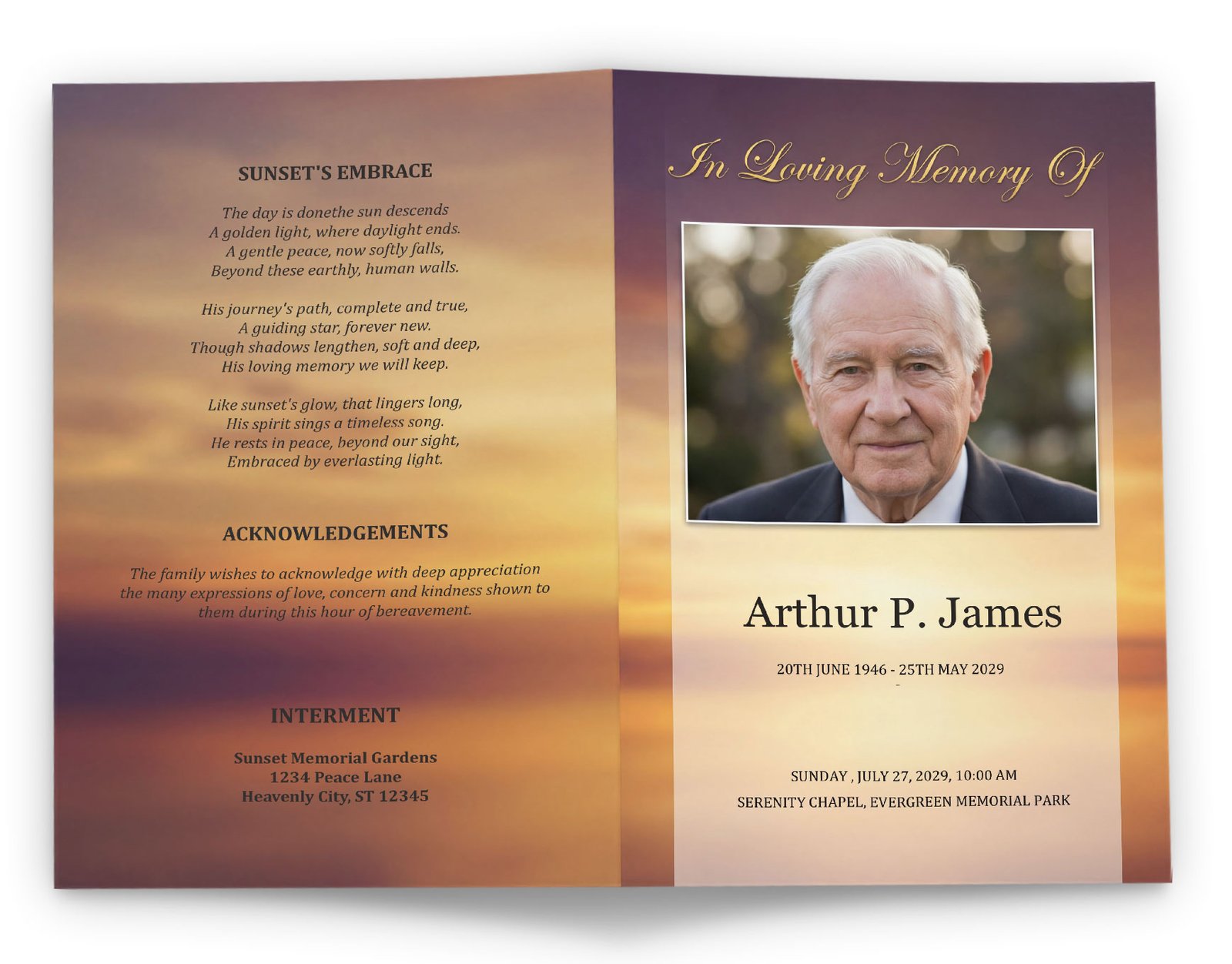 When you choose these funeral card templates, you are getting a professionally crafted layout that balances dignity with natural beauty. The front cover puts your loved one’s portrait center stage, framed by the soft glow of a fading sun. Each element is placed with care to ensure the focus remains on the person being celebrated.