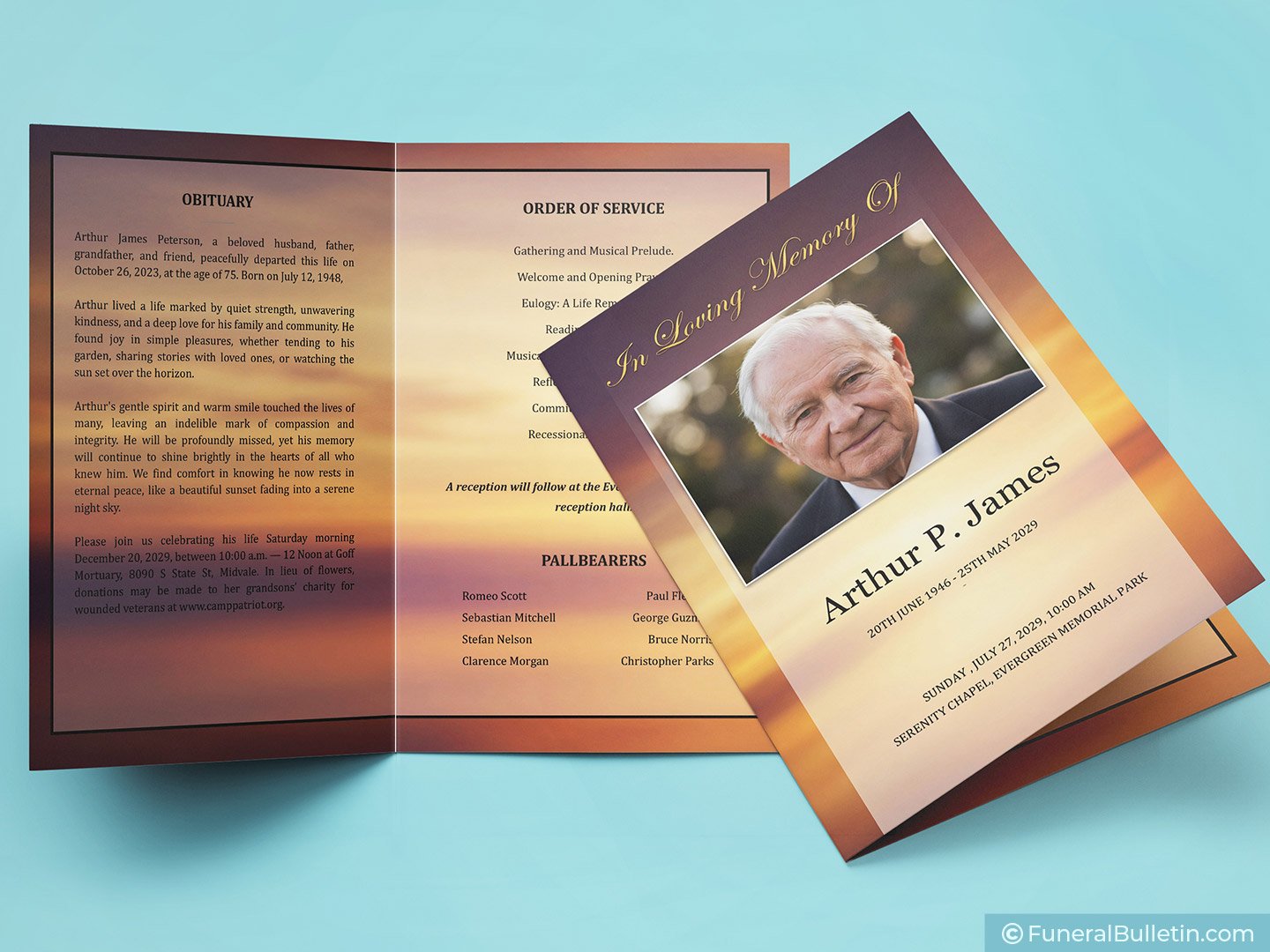 Inside, the layout provides ample space for a detailed obituary, a formal order of service, and a list of pallbearers. We have kept the typography clean and legible so guests can easily follow along during the ceremony.