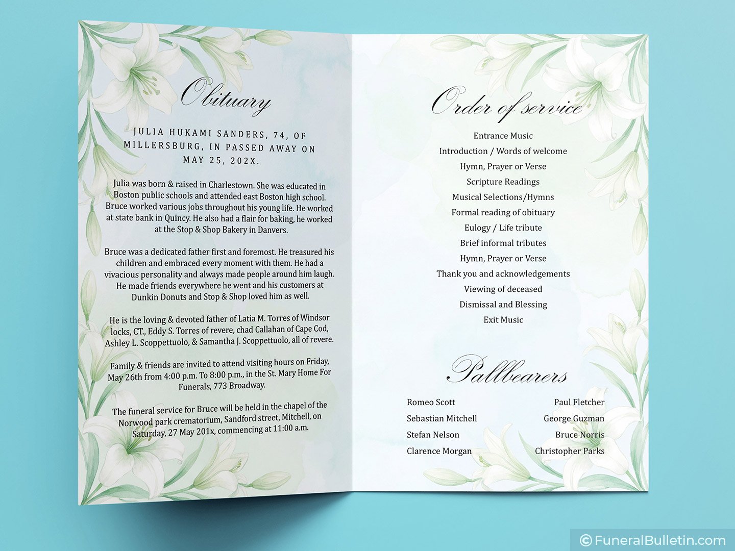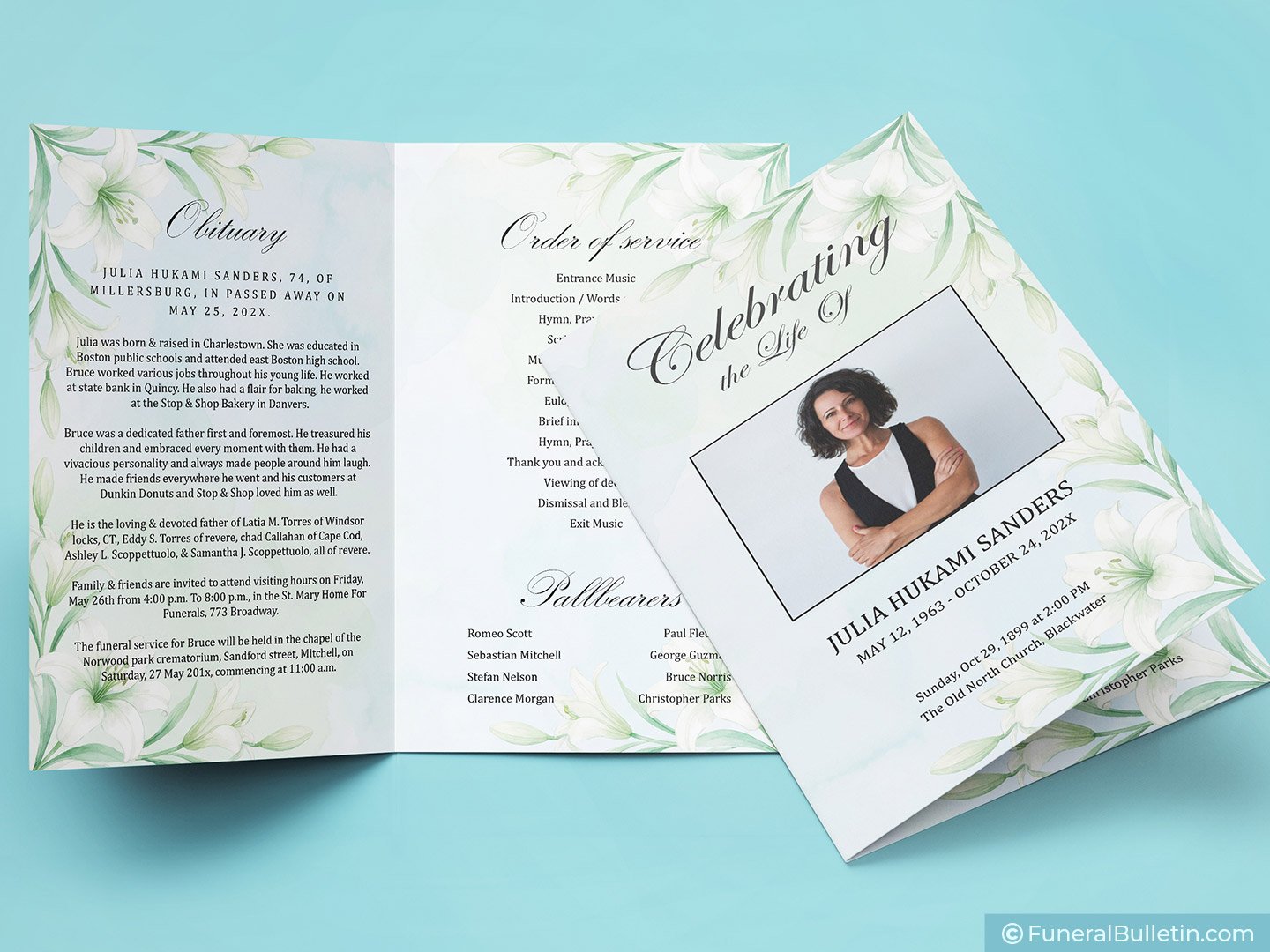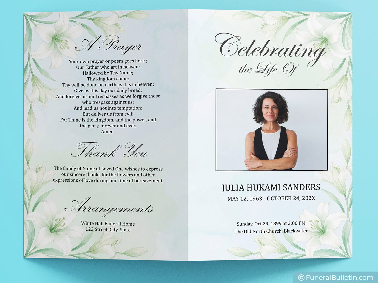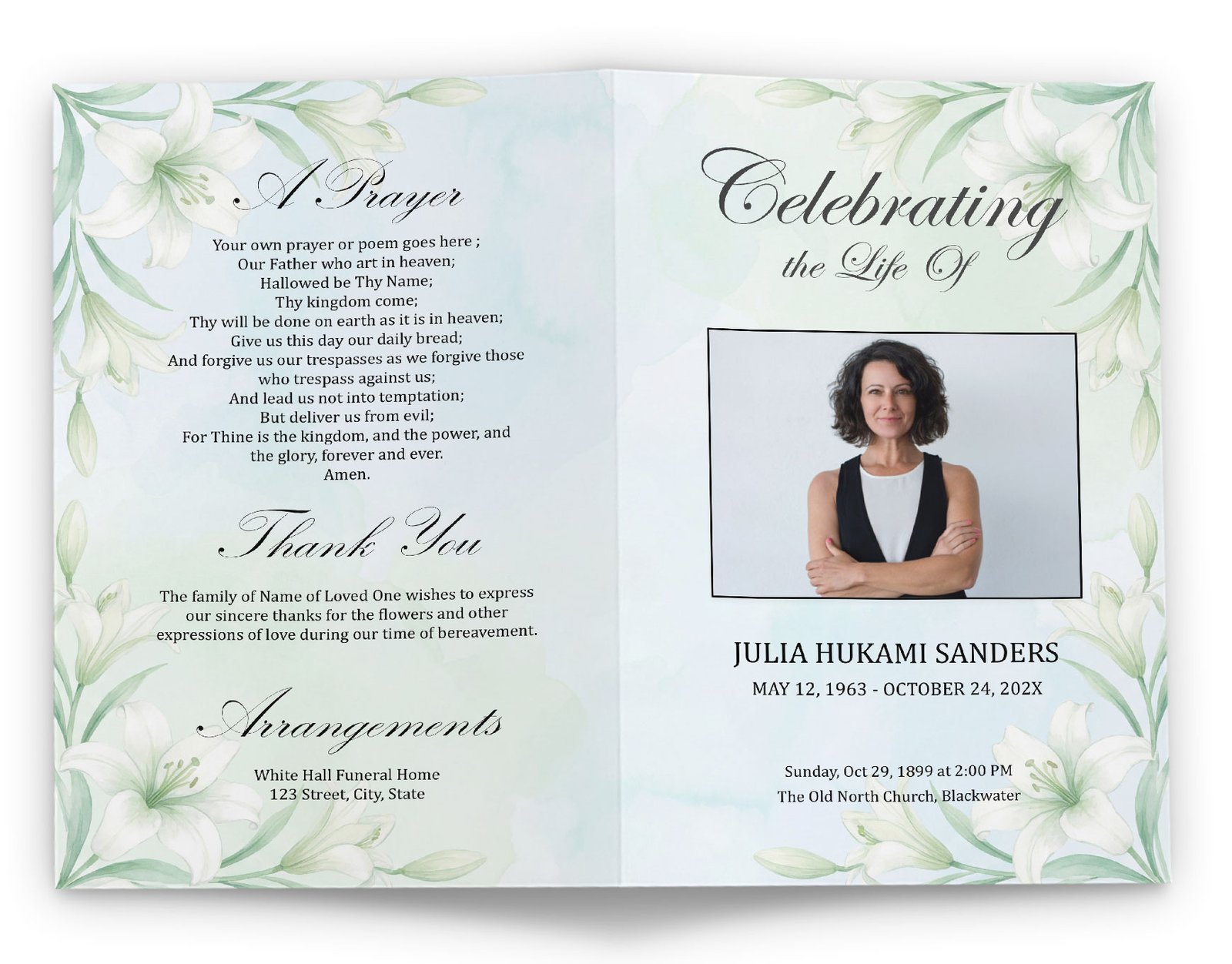 This clean and serene design brings a sense of peace to any memorial. Featuring hand-painted white lilies and soft green foliage, it provides a classic backdrop that honors your loved one with dignity. The layout is spaced perfectly to ensure every word is legible and every photo stands out beautifully against the light, airy background.